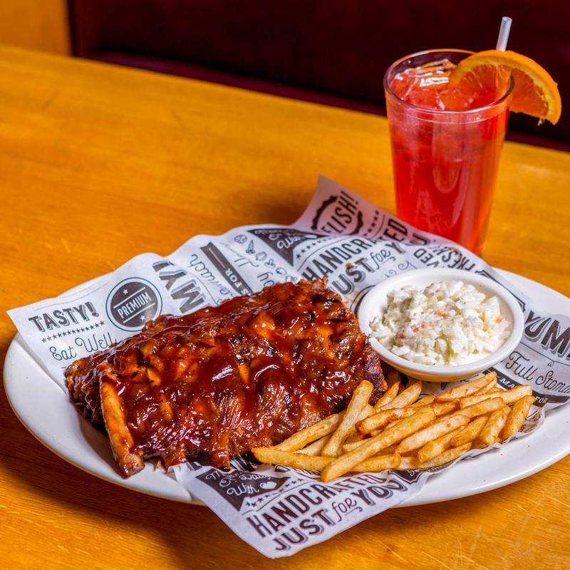 Smoked 4 hrs to perfection, drenched in BBQ sauce. Served with french fries and a salad • 1/2 Slab $14.00 | Full Slab $24.00